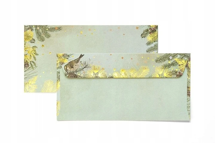 Eleganckie koperty ozdobne w formacie DL (110 × 220 mm), wykonane w kolorze złotym z subtelnym zimowym motywem – szyszki, gałązki sosny oraz ptaszek. Dzięki temu już sam wygląd przesyłki buduje świąteczny nastrój. Gramatura kopert to około 120 g/m², co zapewnia im trwałość i solidny wygląd.