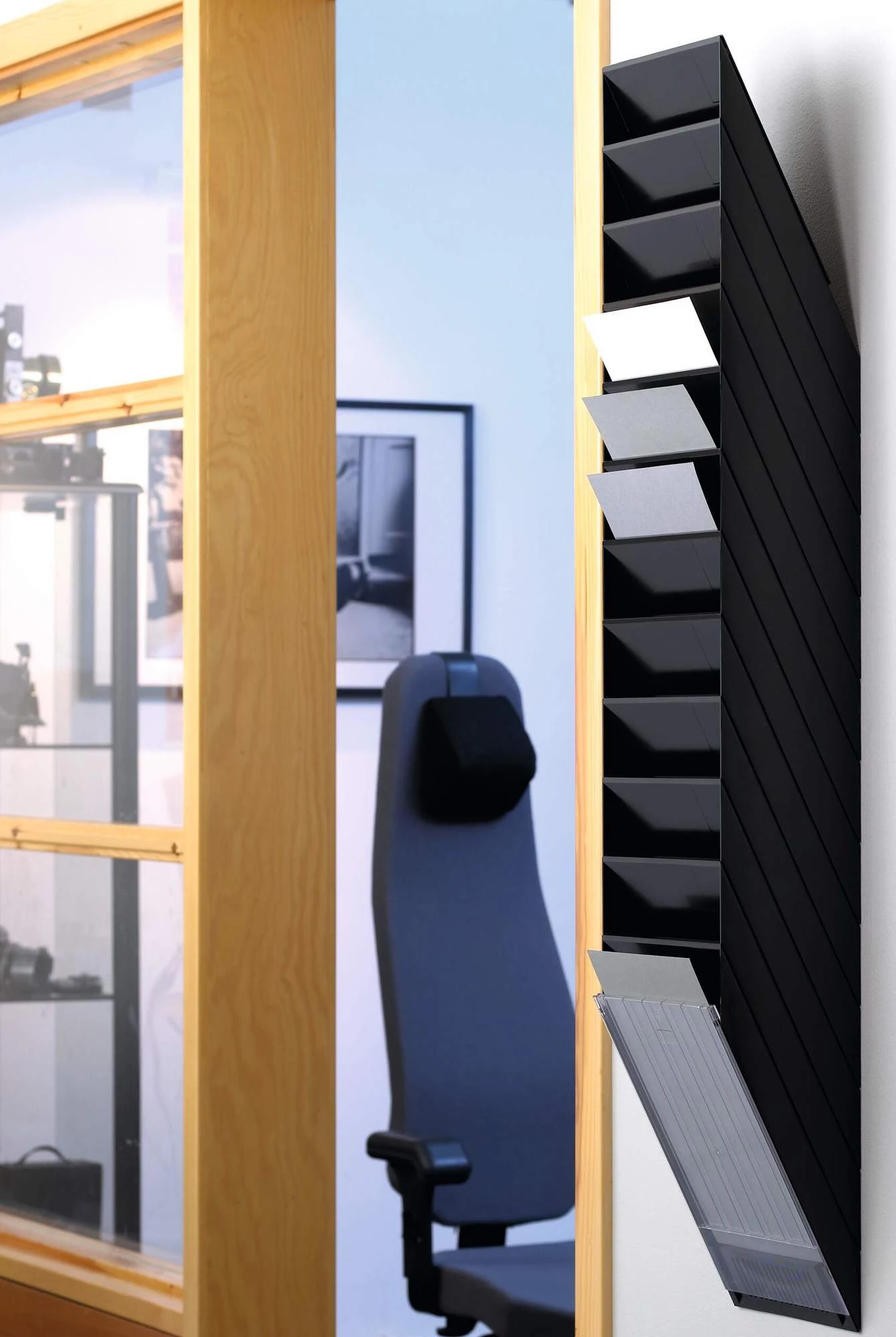 Zestaw 12 pojemników paneli systemu FLEXIBOXX marki Durable to idealne rozwiązanie do organizacji ulotek, katalogów i materiałów formatu A4 w przestrzeni biurowej, recepcji czy punkcie informacyjnym. Pojemniki mocowane są do ściany w układzie pionowym, oferując przemyślaną strukturę przechowywania i schludny wygląd. Czarny kolor oraz minimalistyczna forma sprawiają, że zestaw wtopi się w nowoczesne wnętrze, jednocześnie maksymalizując efektywność organizacji dokumentów.