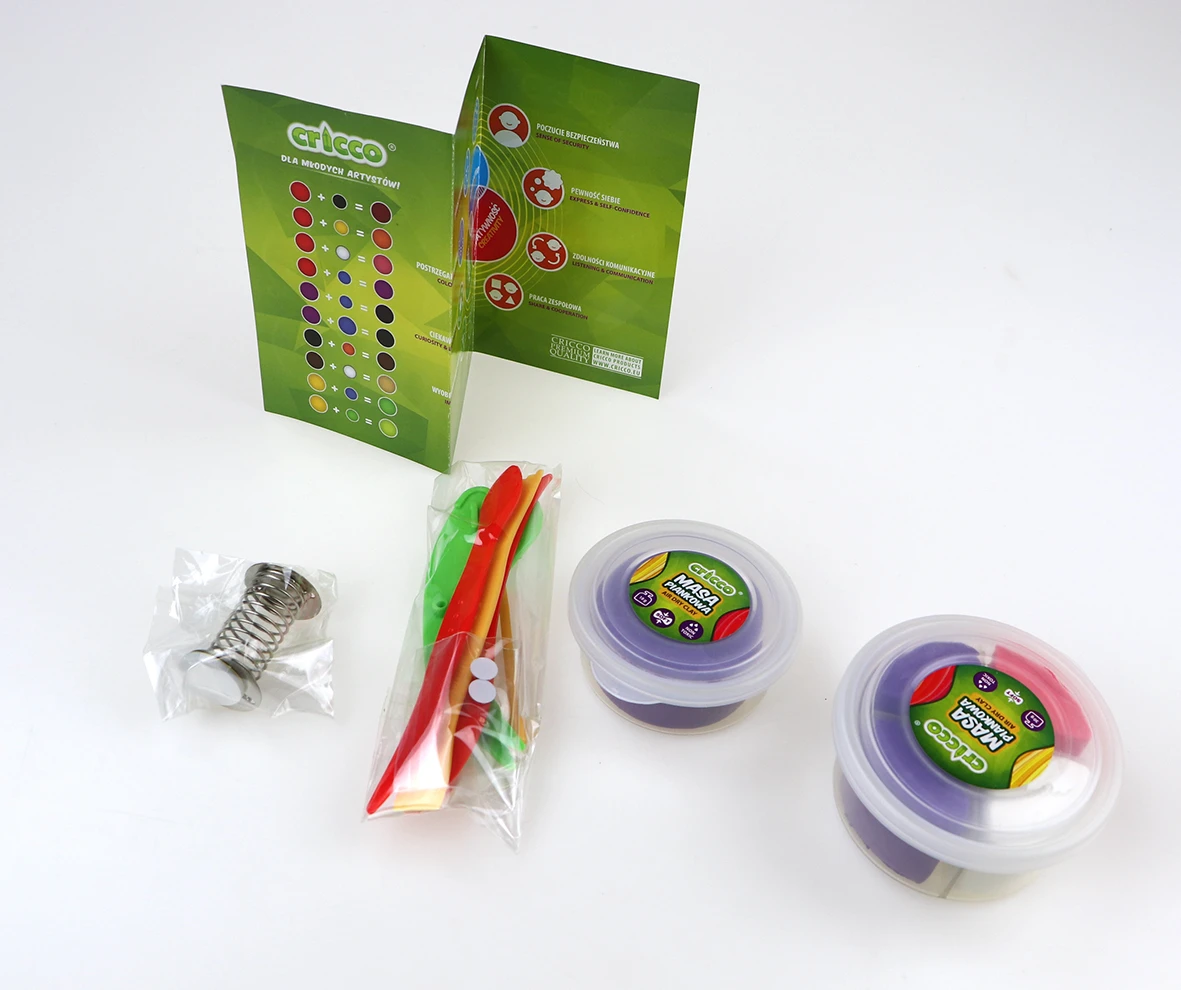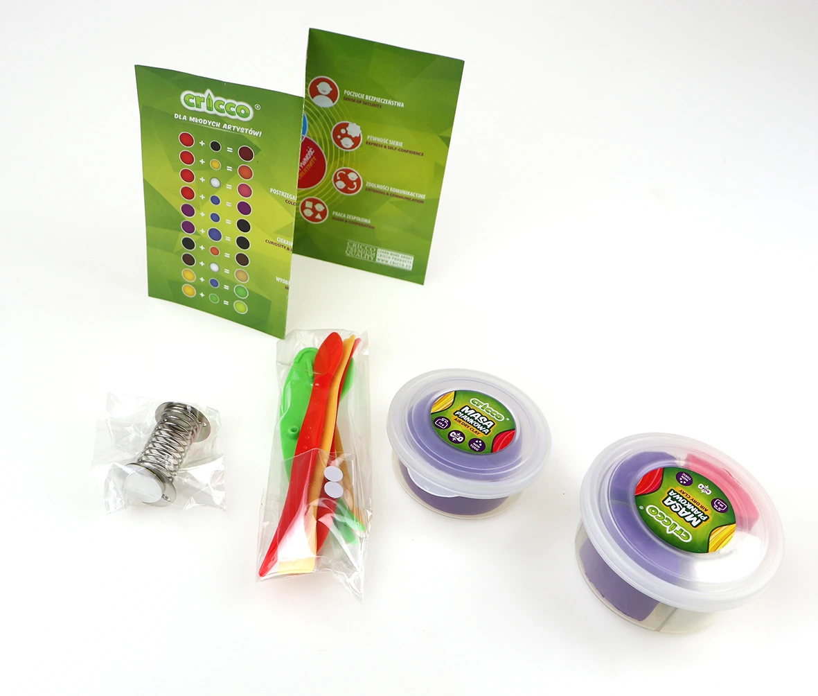 W opakowaniach znajdują się akcesoria do formowania, sprężynka na gotową, ulepioną figurkę oraz elementy dekoracyjne