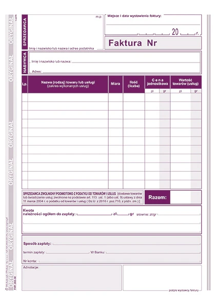 202-3E DRUK FAKTURA DLA PODATNIKÓW ZWOLNIONYCH PODMIOTOWO Z PODATKU A5 ORG + KOPIA PION MP