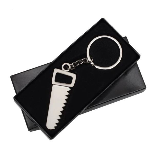 Brelok metalowy w kształcie piły. Pakowany w czarne kartonowe opakowanie upominkowe.