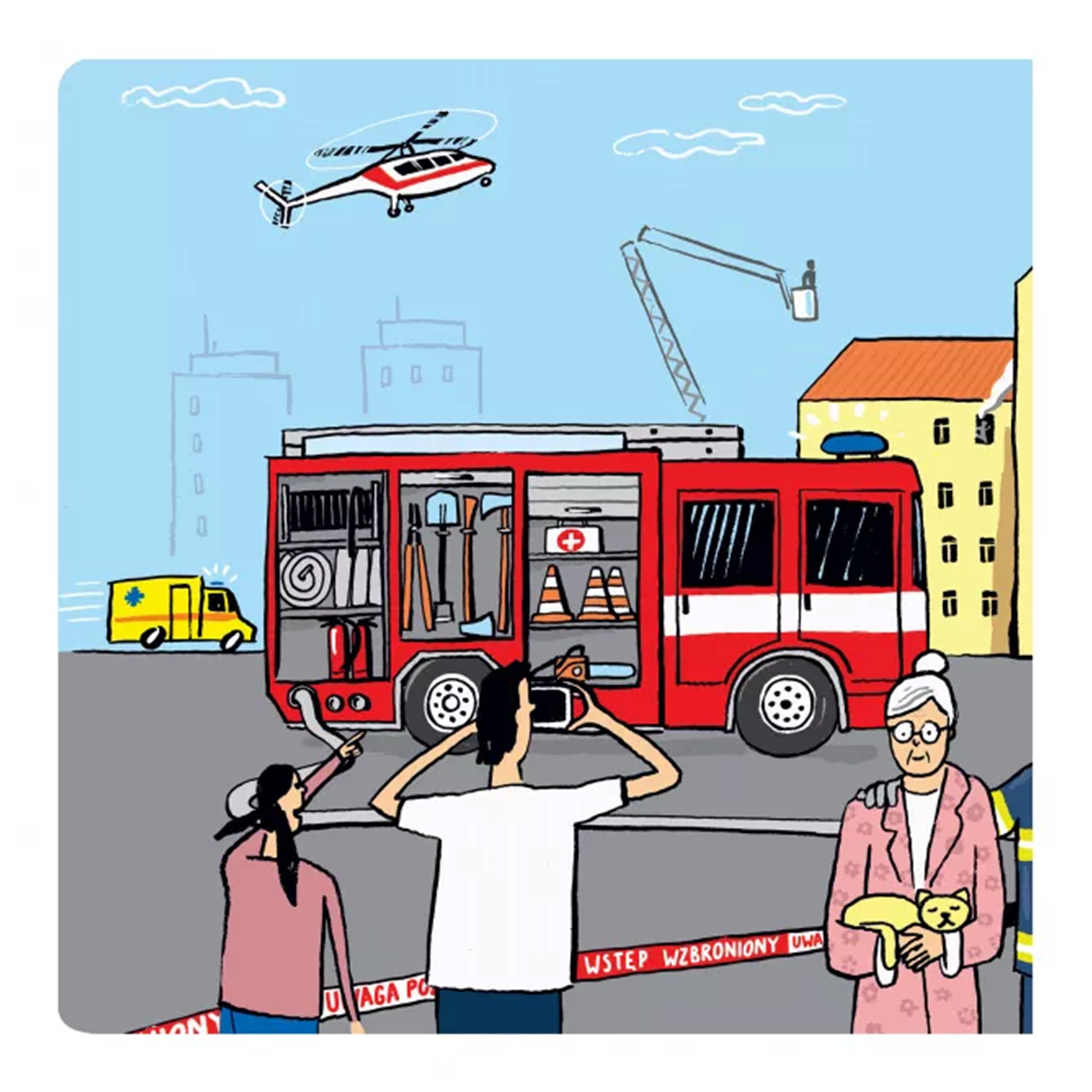 Poznaj kulisy pracy w straży pożarnej! Z tej książki dowiesz się, czego oprócz odwagi, potrzebuje strażak, by wykonywać swoją pracę. Poznamy samochody strażackie, jakich technik używają strażacy i jak zbudują tamę powodziową. W książce są przedstawione sytuacje, w których możesz otrzymać pomoc strażaków. Usłyszysz w niej także nieznane ciekawostki i zagrasz w quizy.